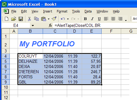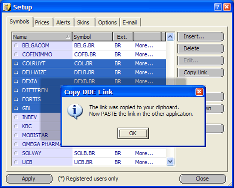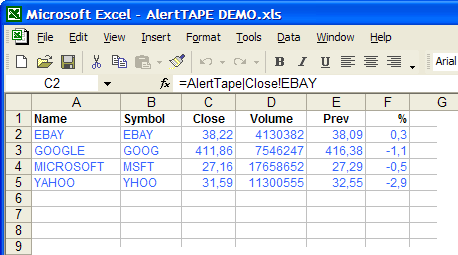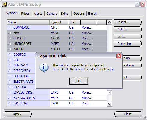 Excel users will find it very usefull that AlertTAPE can be linked directly to Excel (using DDE). So all price updates in the AlertTAPE will also result in an update of your sheets in Excel. Linking AlertTAPE to ExcelIt's very easy to link the AlertTAPE stocks to other programs (like Excel). Go to the "Symbols" dialog and select the stock(s) you want to link to Excel. Next click on the "Copy Link" button. The program will now copy the links of all selected stocks to the clipboard :![]() Creating a new Excel sheetUnexperienced users can choose to let AlertTAPE automatically create a new Excel sheet for them, by simply clicking on "Yes" when the program asks this. Then program will then create the file and open it in Excel. If Excel asks you if you want to update the data from the sheet with new live information, click on "Yes". The sheet will now contain all stocks you did select in AlertTAPE. You will also see that every minute new up to date prices are displayed. Afterwards you can save this sheet on your hard disk, and from now on, you can access this file directly from the AlertTAPE's dropdown menu with the "AlertTAPE Live sheet" option.Using Copy and PasteIf you want to add live data to one of your existing Excel sheets, please ignore the instructions above. The program will also copy the links of the selected stocks to your clipboard :![]() Now open your sheet in Excel and put the cursor on the place where you want to place the selected stocks and select the "Edit - Paste" menu option in Excel : ![]() For each selected stock, the name, the current date, the current time and the last price will be copied in Excel. Even more : the prices of these stocks are LIVE. Every minute your Excel sheet will be refreshed with up to date stock information. You can save this XLS file on your disk but the next time you open this document, just be sure that you start AlertTAPE first, so Excel can restore all links automatically. Example XLS sheetYou still don't have a clue what we're talking about ? Then have a look at one of our sample XLS files (AlertTAPE Live demo.XLS) and see how it works.Unregistered usersIf you are using an unregistered version of AlertTAPE, you will be able to link only 5 stocks to Excel. All other data will be marked in Excel with a "(register)" label.AlertTAPE DDE FieldsThis is a topic for experienced Excel users only. Not all available data from AlertTAPE is linked to Excel, only the name, date, time and the close is. Below is a list of all commands that can be used to link AlertTAPE to Excel using DDE commands :