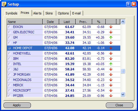 The "Prices" dialog shows all recent stock prices. To display the "Prices" dialog simply click on the "Dropdown" button on the right of your screen and select the "Prices..." menuitem : Extended prices screenYou may also want to customize the displayed table. Click with the right mouse button on the table's header to display a new popup window. Here you can activate (or desactivate) columns and if you want to change the columns order just click on the "Table properties..." option.When displaying more price columns, you may also want to enlarge the complete dialog. This can be done by dragging the bottom right corner of this window. These settings are automatically saved for further usage.
